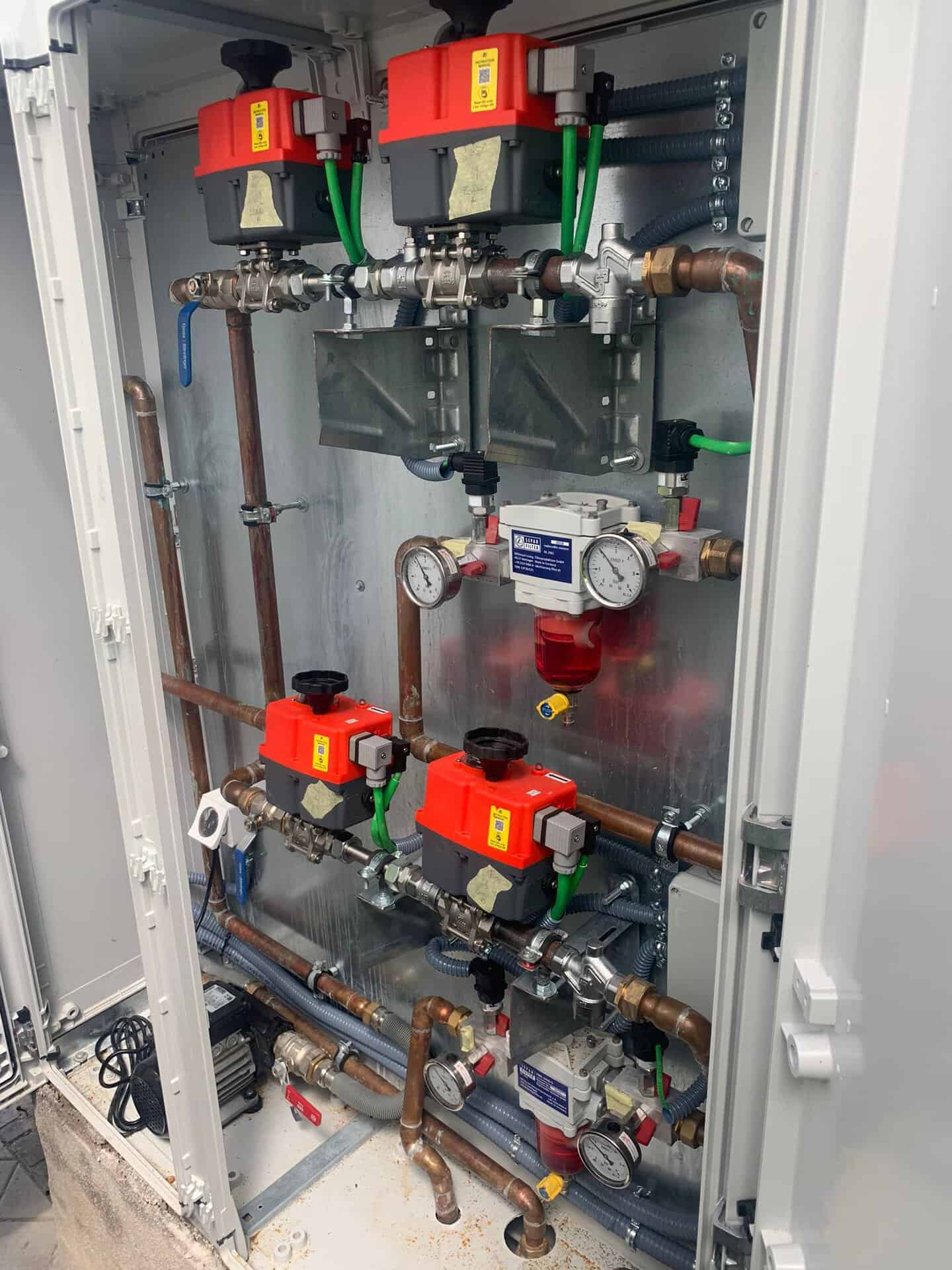 L’installation complète consiste en deux systèmes différents d’alimentation en carburant pour les groupes électrogènes, contrôlés par un automate programmable. L’installation complète comprend deux réservoirs de stockage principaux, deux panneaux de contrôle du carburant basés sur un PLC, qui contrôlent deux pompes +ATAM-3200 GET duplex et tous les instruments de mesure du carburant.
