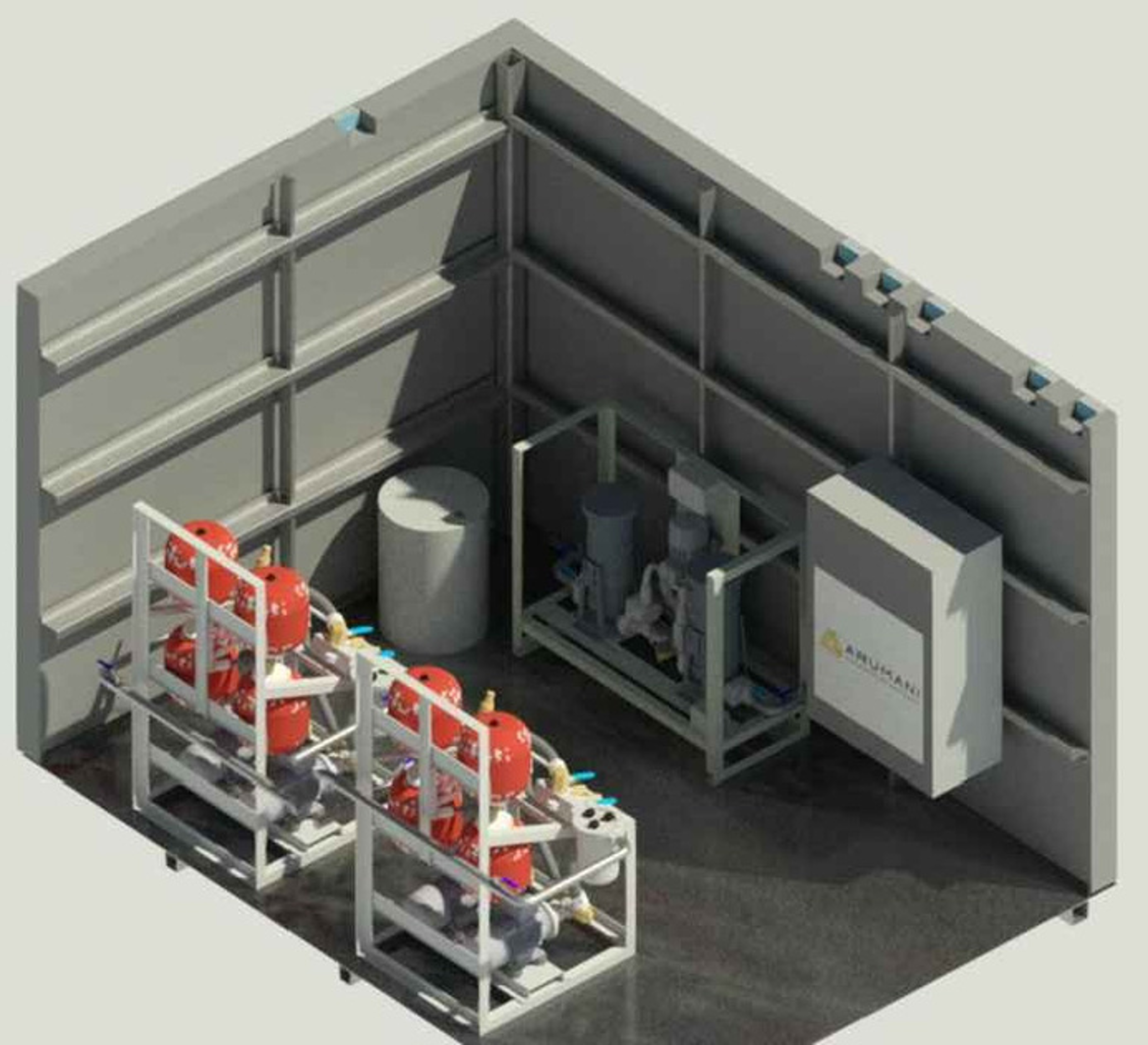 ARUMANI fabrique le conteneur technique, tandis qu’Inpro y intègre les groupes de pression, les systèmes de filtration et les panneaux de contrôle, créant ainsi une solution clé en main, prête à être installée et à fonctionner immédiatement.