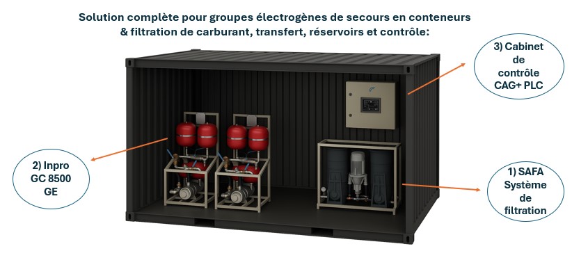 Solution Complète pour Groupes Secours en Container & Fuel Polishing, Transfert, Réservoirs et Contrôle